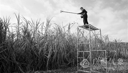 广西气象部门积极开展粮食安全、特色农业气象服务。图为气象工作人员在甘蔗地开展科学试验